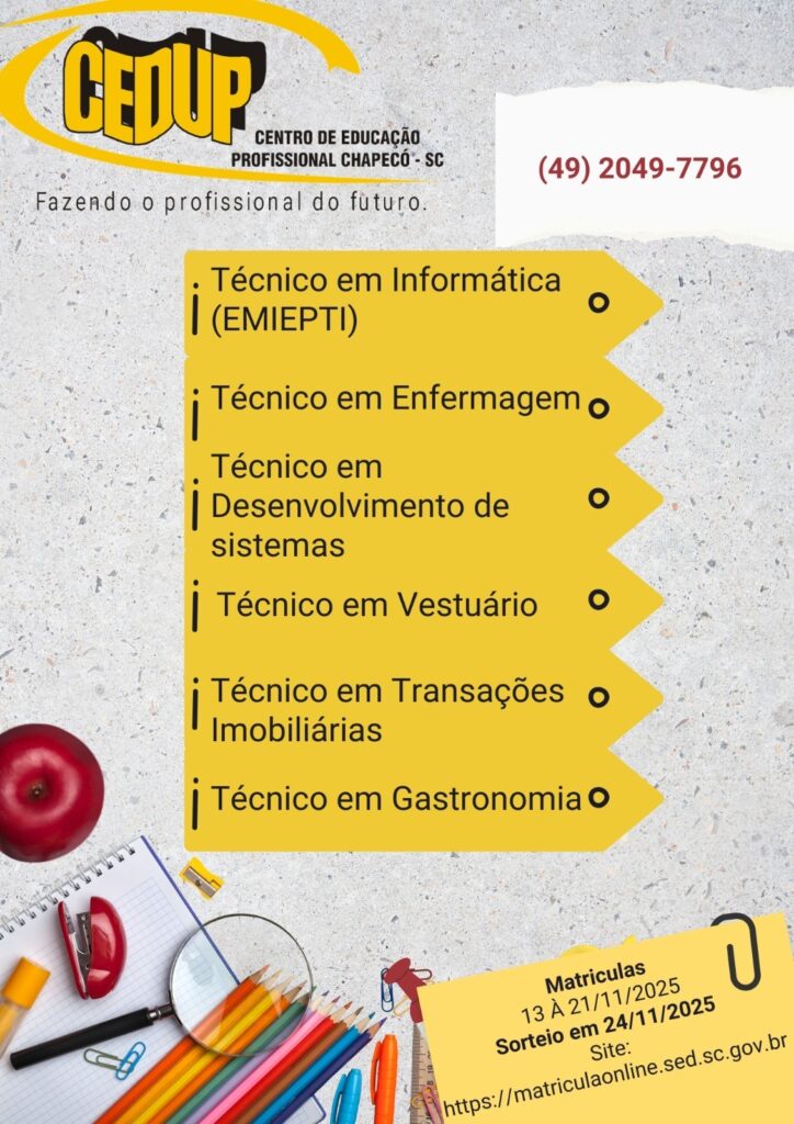 O Centro de Educação Profissional (CEDUP) de Chapecó está com inscrições abertas para os cursos técnicos que terão início em 2026. A oportunidade é ideal para quem deseja investir na formação profissional e conquistar espaço no mercado de trabalho com qualificação reconhecida e gratuita.