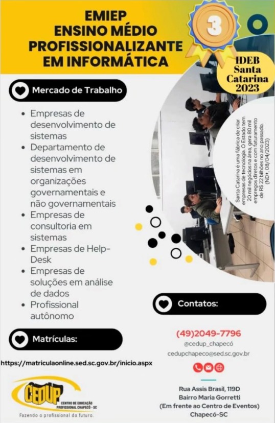 O Centro de Educação Profissional (CEDUP) de Chapecó está com inscrições abertas para o Ensino Médio Integrado à Educação Profissional (EMIEP) na área de Informática. A oportunidade é voltada a estudantes que desejam cursar o ensino médio junto com uma formação técnica em uma das áreas mais promissoras do mercado: Tecnologia da Informação.