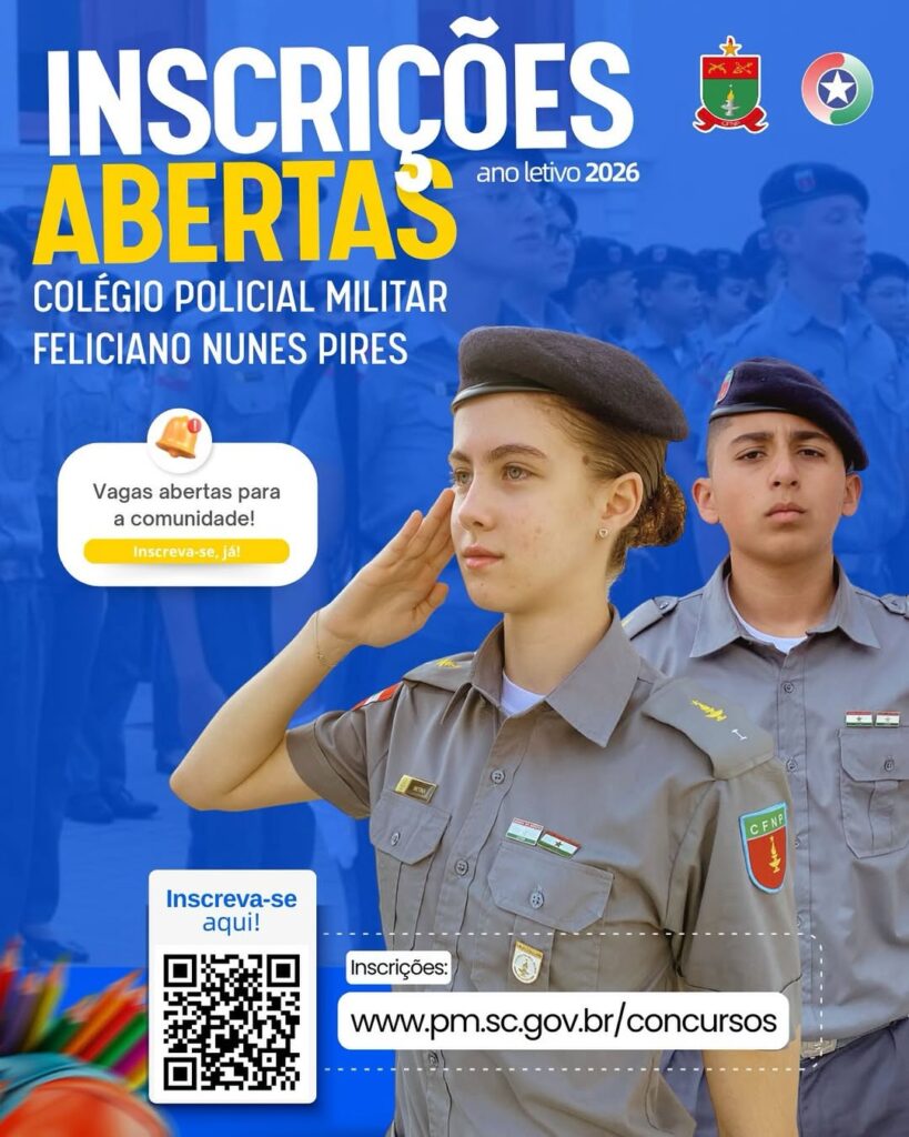 A Polícia Militar de Santa Catarina (PMSC) abriu, nesta quinta-feira (30), as inscrições para o processo seletivo de ingresso no Colégio Policial Militar Feliciano Nunes Pires (CFNP) para o ano letivo de 2026. Ao todo, são ofertadas 309 vagas distribuídas entre sete cidades do Estado, incluindo Chapecó. As inscrições seguem até 5 de novembro, exclusivamente pela internet.