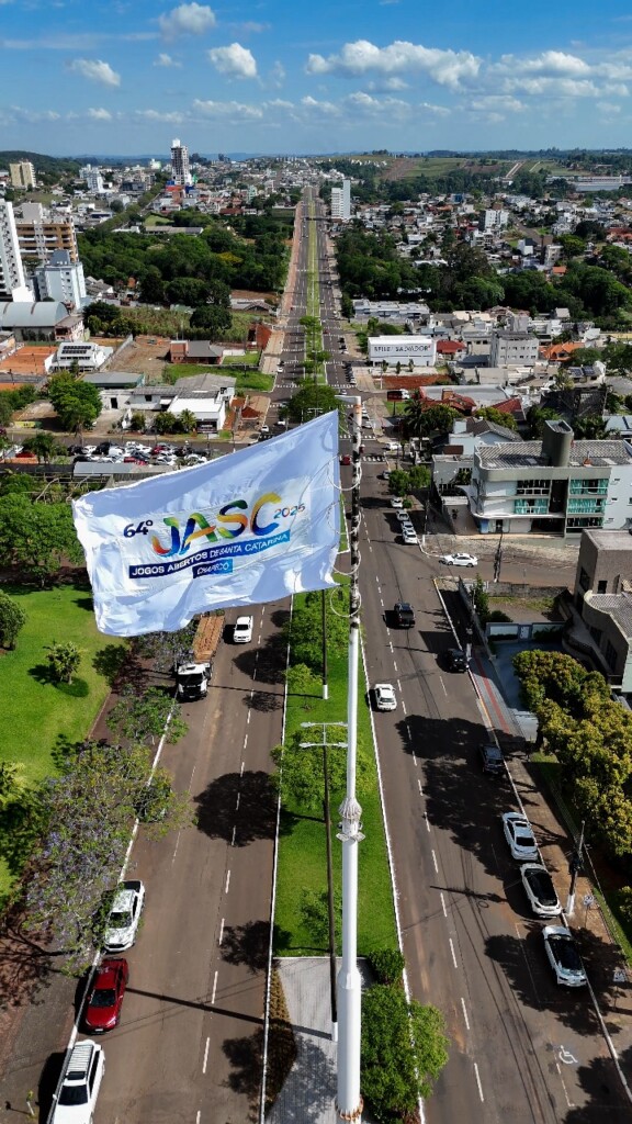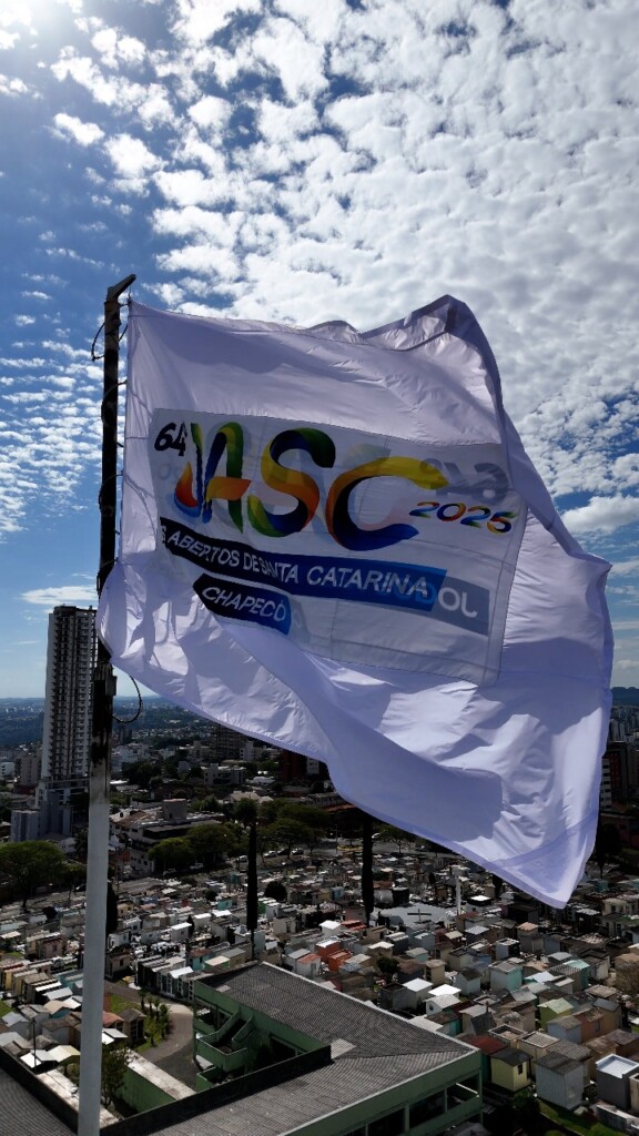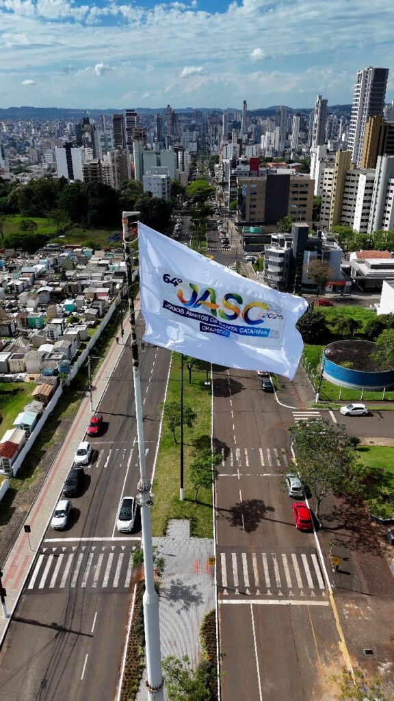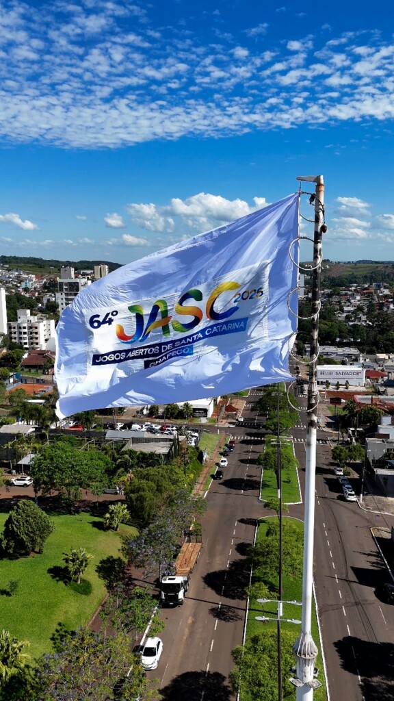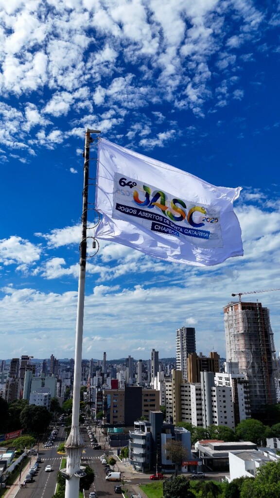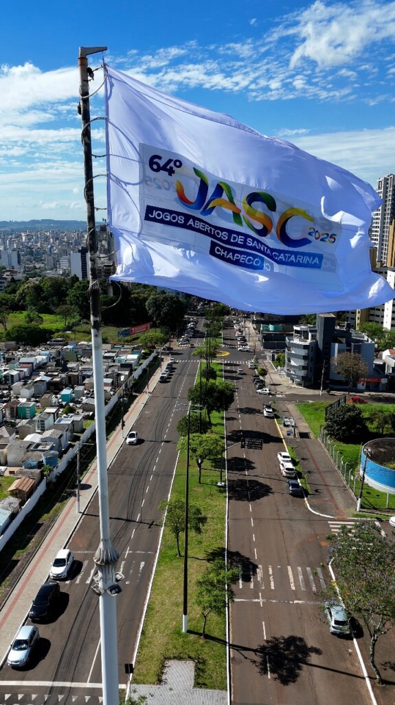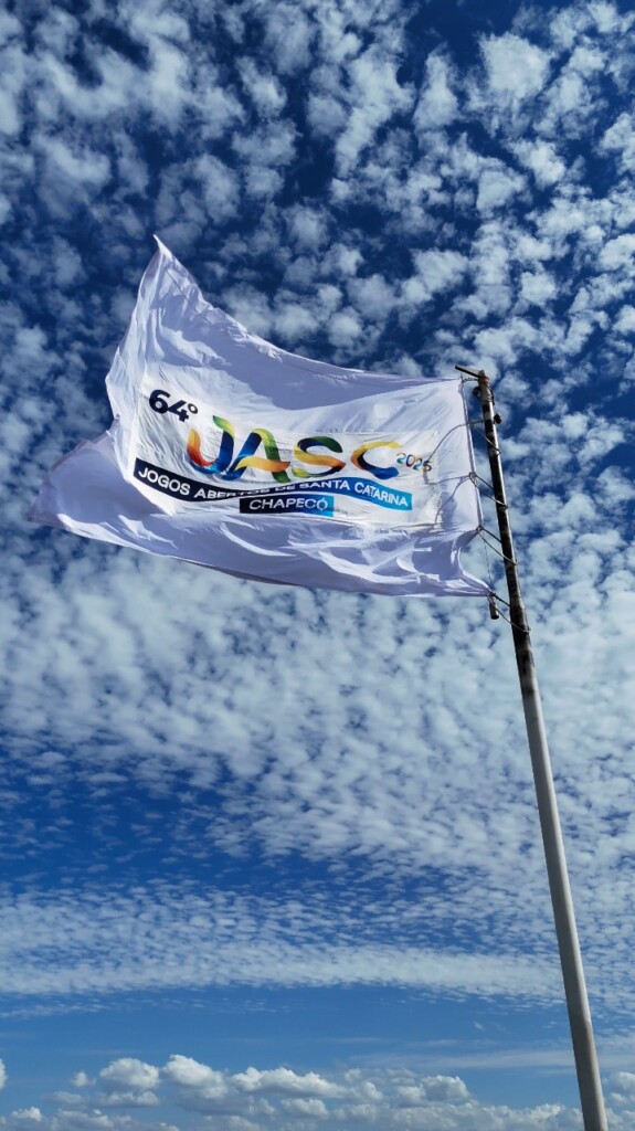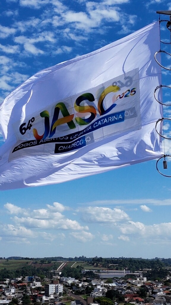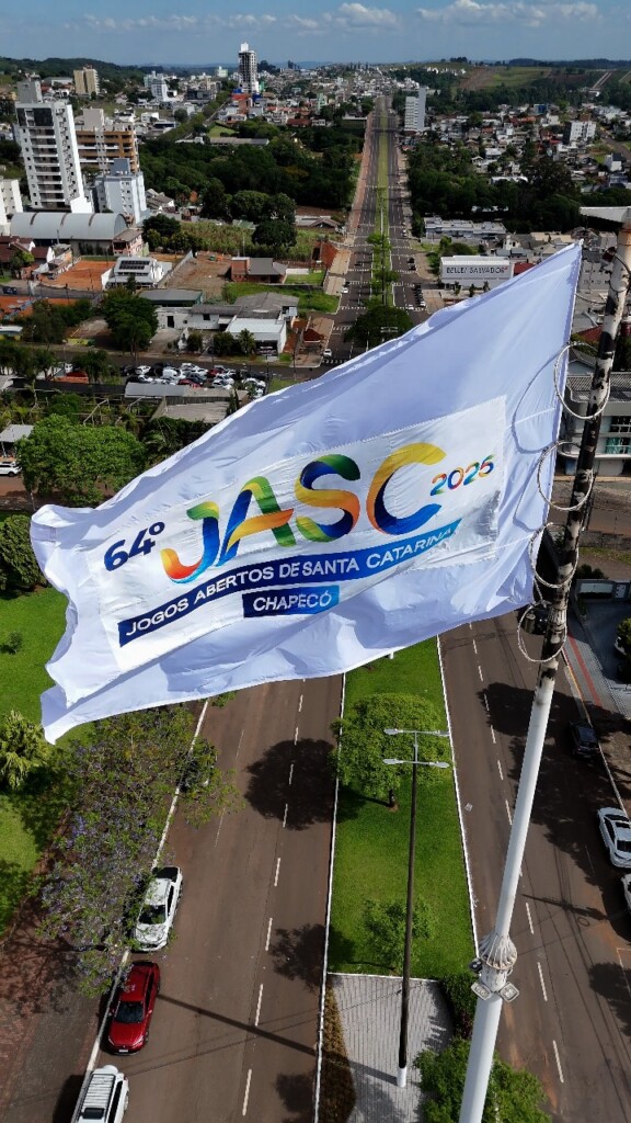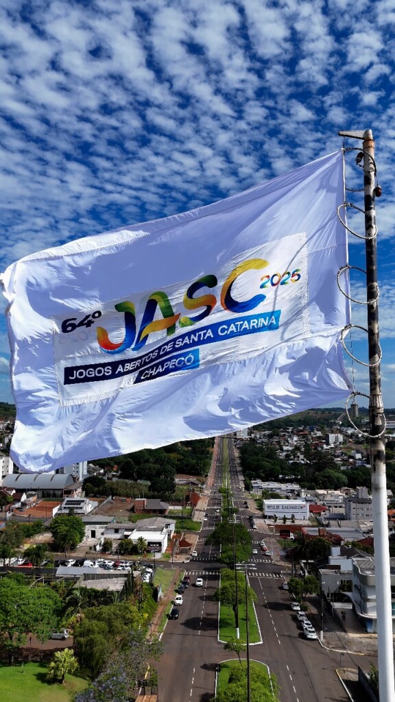 A pouco mais de duas semanas do início dos Jogos Abertos de Santa Catarina (JASC) 2025, Chapecó já começa a respirar o clima da competição. Na manhã desta quarta-feira (5), uma bandeira oficial dos JASC, medindo 4,5 metros por 6 metros, foi hasteada no mastro de 37 metros em frente à Prefeitura Municipal, na Avenida Getúlio Vargas, substituindo temporariamente a bandeira do município.