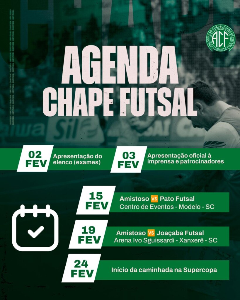 A Associação Chapecoense de Futsal confirmou a realização de dois amistosos no mês de fevereiro, como parte da preparação para as competições oficiais da temporada 2026. Os testes servirão como aquecimento para o principal desafio do início do ano: a inédita participação do clube na Supercopa do Brasil.