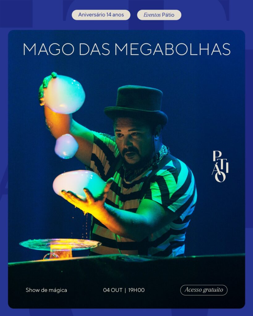 O aniversário do Pátio Shopping será celebrado neste sábado (4) com um espetáculo que promete encantar todas as idades. O show do artista conhecido como Mago das Mega Bolhas acontece às 19h, na Praça de Alimentação, e tem acesso gratuito.