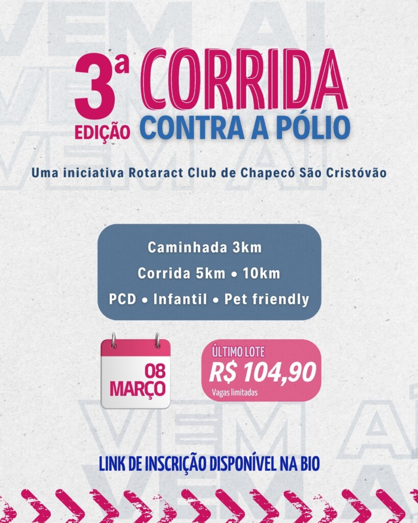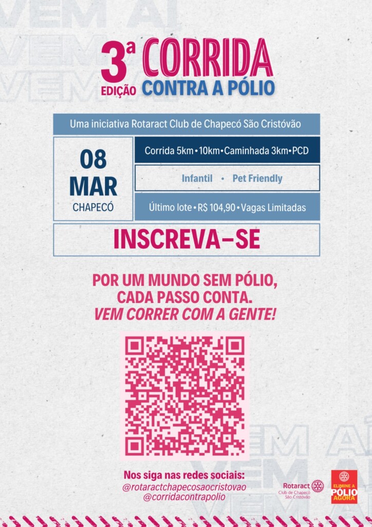 A 3ª edição da Corrida Contra a Pólio, promovida pelo Rotaract Club de Chapecó São Cristóvão, será realizada no dia 08 de março de 2026, em Chapecó, com percursos de 5km e 10km de corrida individual, além de uma caminhada de 3km e circuito kids.