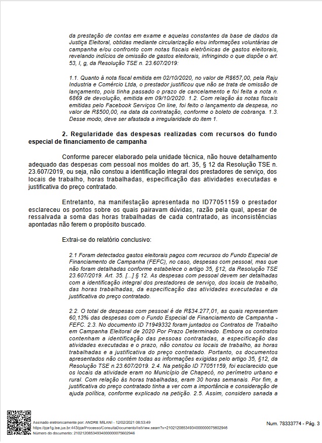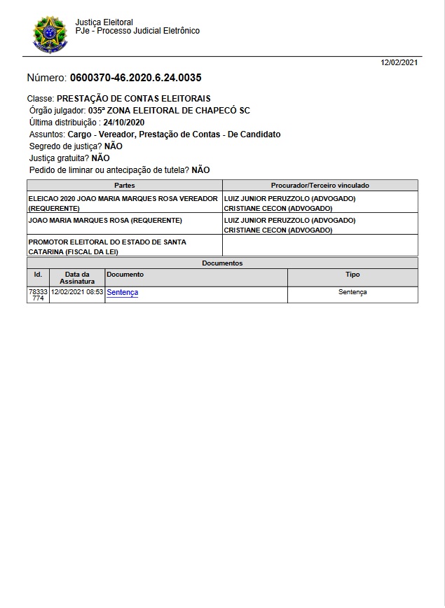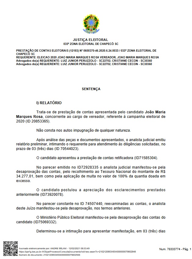 As contas de campanha do vereador Dr. João foram desaprovadas pela Justiça Eleitoral na quinta-feira (11). A decisão foi do Juiz Eleitoral da 035ª Zona Eleitoral de Chapecó, André Milani. João foi o segundo candidato mais votado na eleição de 2020, com 2335 votos e atualmente ocupa o cargo de presidente da Câmara Municipal de Vereadores.