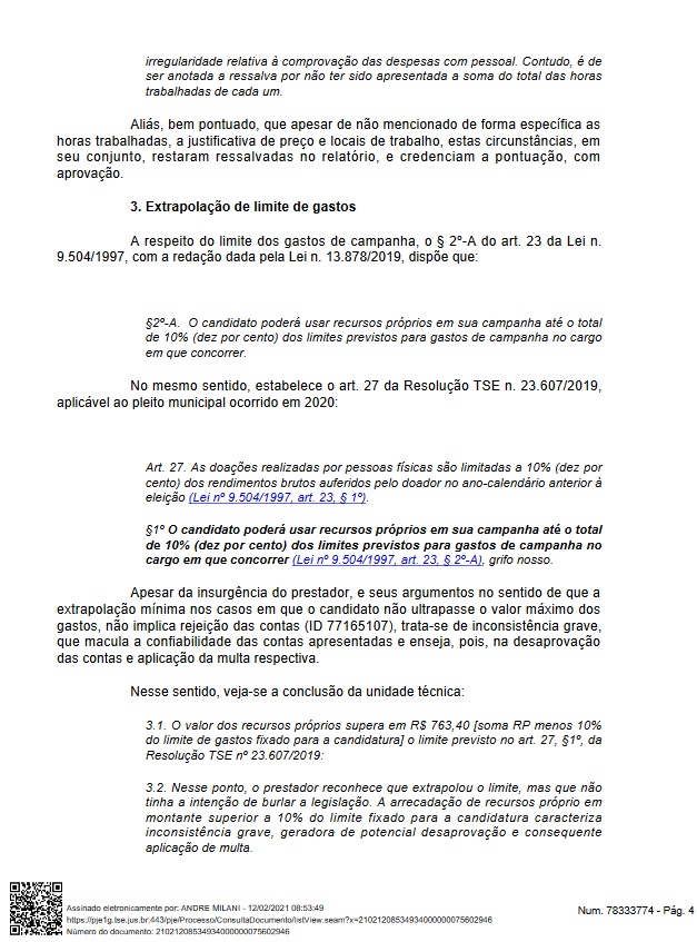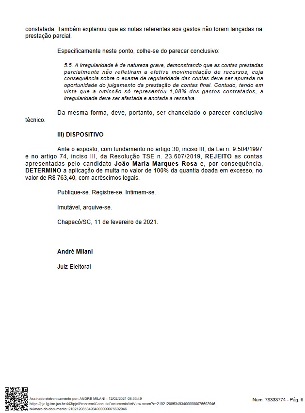 Na decisão do Juiz André Milani, ele rejeitou as contas apresentadas pelo candidato João Maria Marques Rosa e determinou a aplicação de multa no valor de 100% da quantia doada em excesso, no valor de R$ 763,40, com acréscimos legais.