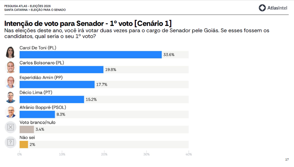 De acordo com a pesquisa, diferentes cenários foram simulados para a eleição estadual, indicando que a disputa segue aberta e pode variar conforme a composição dos candidatos. Entre os nomes avaliados, Jorginho Mello aparece como uma das principais lideranças, enquanto João Rodrigues surge como potencial adversário competitivo.