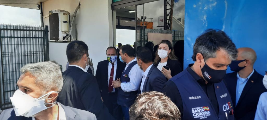 Ele é acompanhado pelo prefeito de Chapecó, João Rodrigues (PSD) e o governador de Santa Catarina, Carlos Moisés (PSL), entre outras autoridades de Santa Catarina. Antes de chegar no município, Pazuello cumpria agenda em Cascavel, no Paraná.