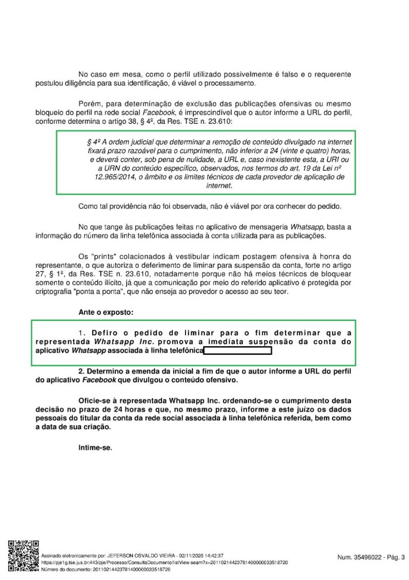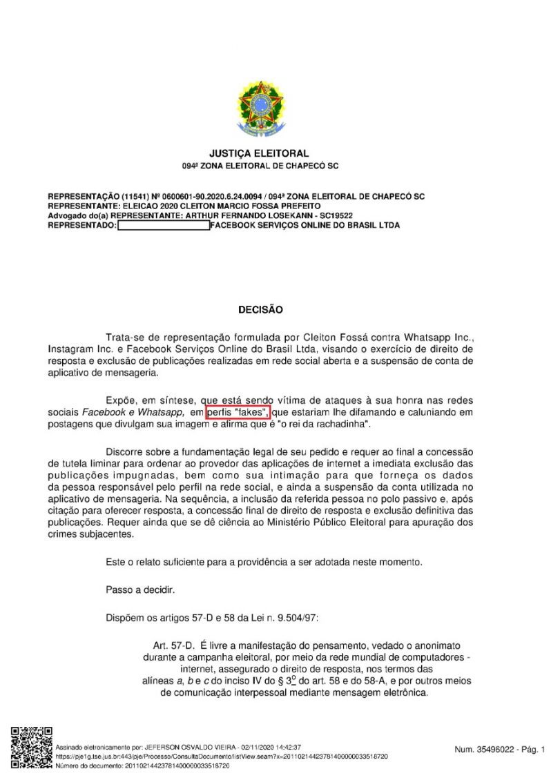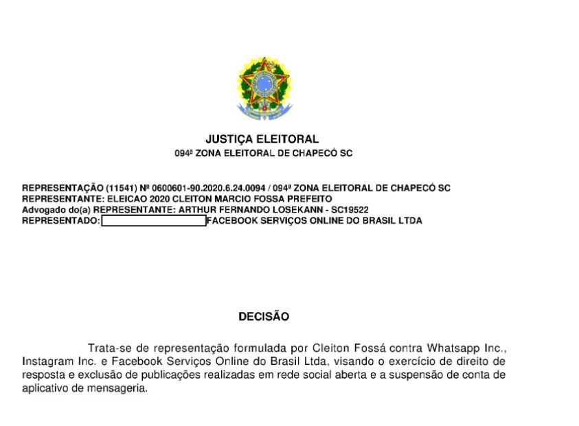 A justiça determinou a suspensão dos perfis do WhatsApp que promoveram ataques ao candidato a prefeito pelo Movimento Democrático Brasileiro (MDB), Cleiton Fossá. Os perfis citados compartilhavam por aplicativo, desde a última semana. Além do WhatsApp, o candidato sofreu ataques infundados também pelo Facebook e Instagram.