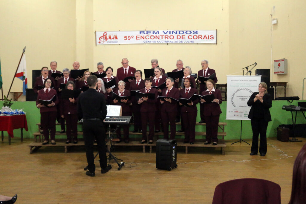 O Coral Alegria de Cantar foi fundado em 2003 e é filiado à Liga Cultural e Artística do Oeste Catarinense desde 2005. Desde 2018 o grupo desenvolve projetos de circulação e leva toda a alegria de cantar para instituições, entidades e eventos gratuitos. Atualmente, possui 32 integrantes. Os ensaios acontecem semanalmente, em Chapecó, sob o comando do maestro Maurício Minozzo, que vem acompanhando a evolução artística de cada integrante do grupo. “O Coral Alegria de Cantar é formado por pessoas que aprendem, se superam e descobrem coisas novas a cada ensaio. Ver um grupo tão diverso unido pela música, compartilhando emoções, desafios e conquistas, reafirma o quanto a arte é um espaço de encontro e pertencimento. Este projeto não entregou apenas apresentações, trouxe novas vivências, novos aprendizados e uma energia renovada para todos nós. Como maestro, concluir este circuito é sentir que cada voz encontrou um pouco mais de si mesma, e que, juntos, seguimos construindo algo maior do que nós mesmos”, declara o maestro.