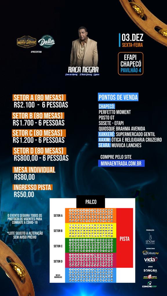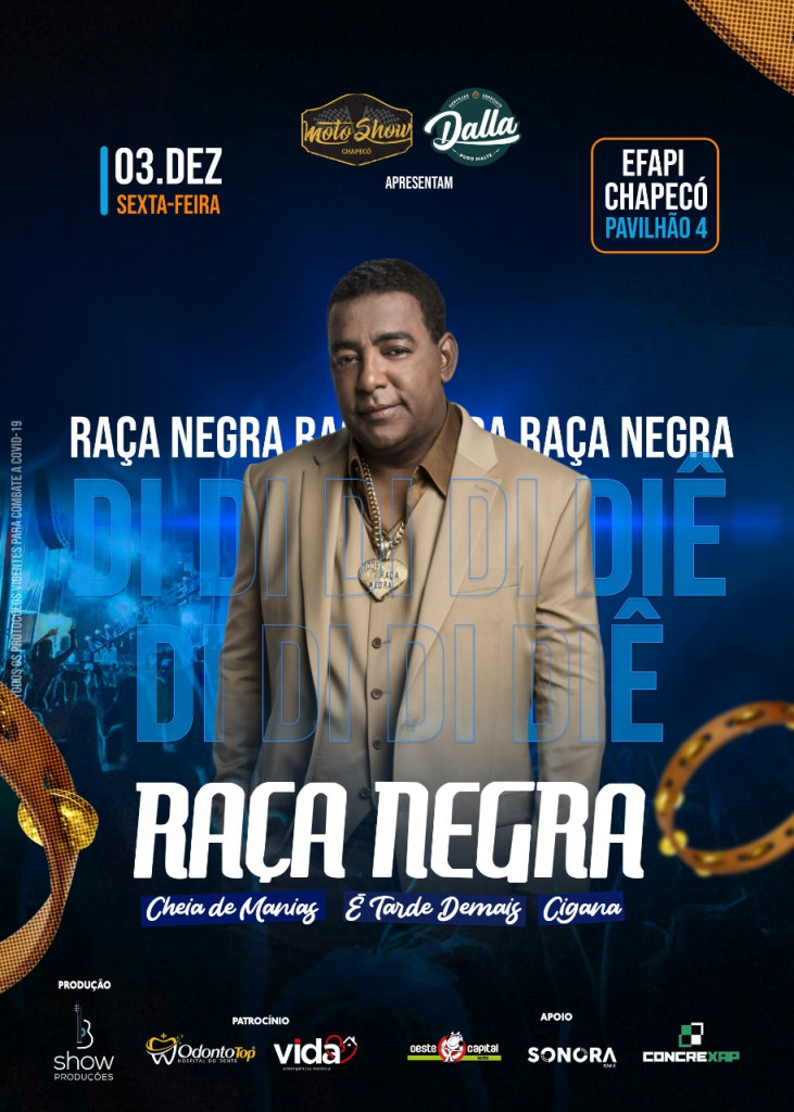 O Raça Negra, um dos maiores grupos de samba e pagode do Brasil, se apresentará em Chapecó no dia 4 de dezembro. Com músicas que marcaram a vida de muitas pessoas, e que até hoje contagia a todos,você vai entrar no ritmo e cantar “Didididiê Didididiê ê ê”, por todos os cantos. Uma estrutura completa pensada no seu bem estar, faz parte do evento, que é produzido pela Bshow, MotoShow e Dalla, seguindo todas as regras de enfrentamento à pandemia.