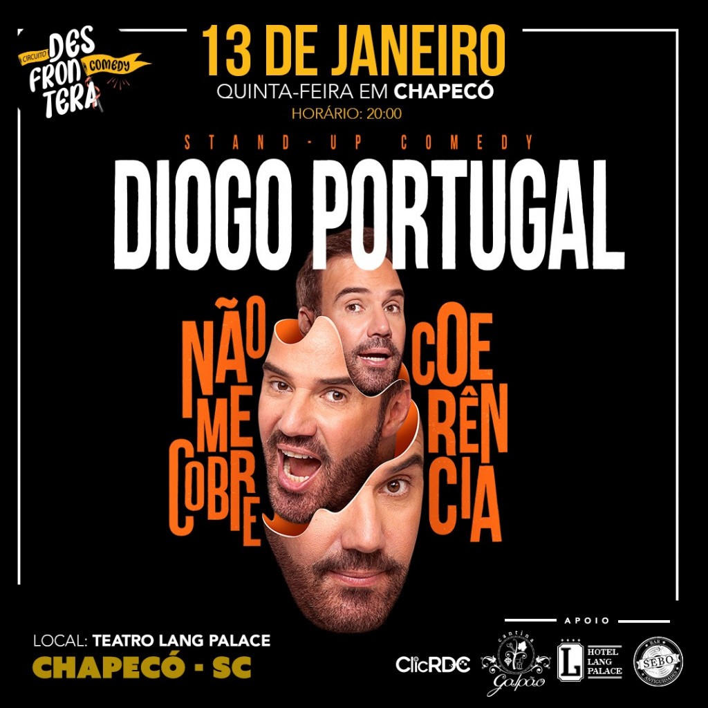Diogo Portugal vai abrir a agenda do Circuito Desfrontera Comedy em Chapecó a partir desta quinta-feira (13). Reconhecido nacionalmente, o humorista ganhou destaque no Programa “Zorra Total”, da Rede Globo, e atualmente faz parte do elenco da “Praça é Nossa”, no SBT. Ele também é criador e idealizador do “Fritada”, programa que começou na internet e fez sucesso no canal Multishow.