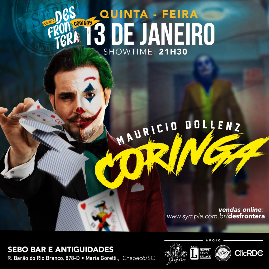 E também em janeiro, o mágico e humorista chileno, Maurício Dollenz entra em cartaz no Sebo Bar e Antiguidades, todas as quintas em Chapecó. Esse é o quinto especial do humorista e acontece somente no Oeste Catarinense. Então aproveite para curtir esse show antes do restante do Brasil, pois logo ele sairá em turnê pelo país. A estréia também ocorre hoje e os últimos ingressos estão a venda.
