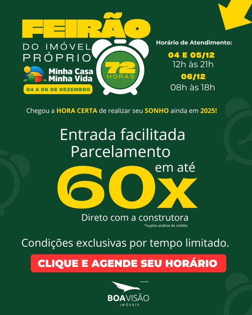 O evento acontece nos dias 04, 05 e 06 de dezembro, com atendimento estendido para facilitar a vida de quem trabalha. Serão três dias de condições únicas, brindes exclusivos e consultoria completa para quem quer dar o passo definitivo rumo à casa própria.