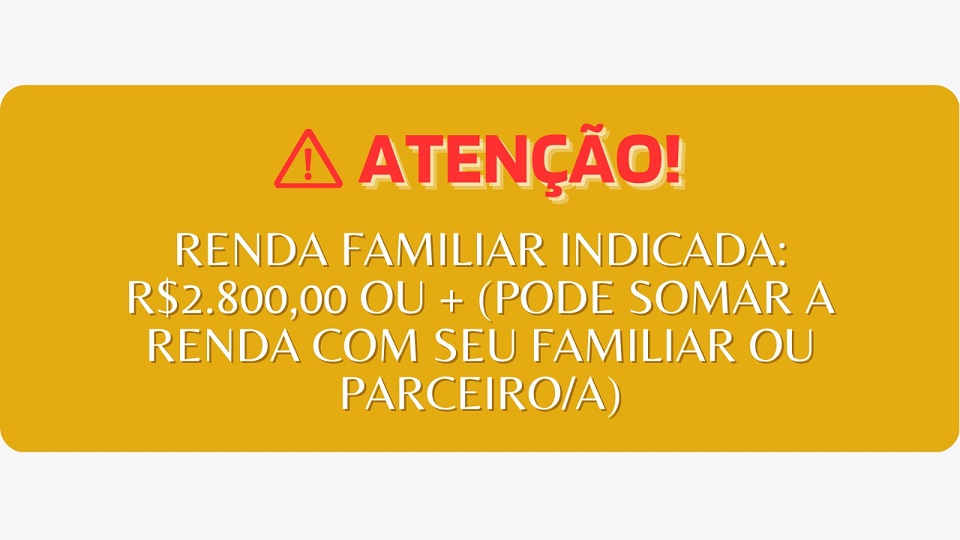 Importante: fique atento à sua renda familiar. A indicação é de R$2.800,00 ou mais, mas não se preocupe, não precisa ser só a sua renda. Você pode somar a renda com seu familiar ou parceiro(a).
