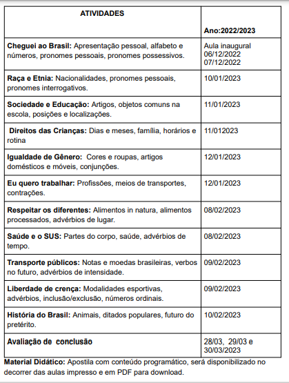 O objetivo do projeto é o acolhimento linguístico e o ensino do português do Brasil para os estrangeiros, possibilitando a inclusão dos mesmos, melhorando a fala, escrita e leitura. A associação busca envolver toda a comunidade  com responsabilidade para romper as barreiras do preconceito.