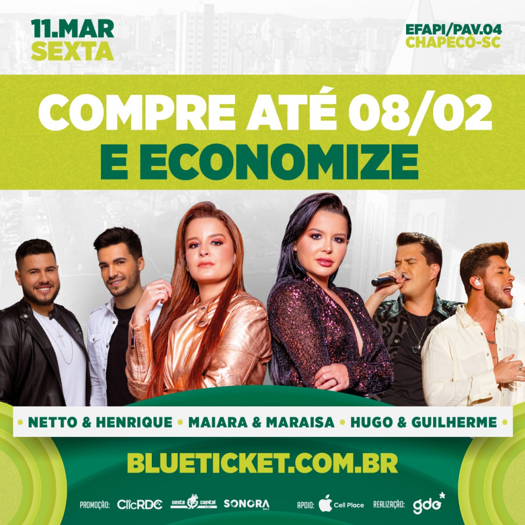 Com um repertório que não sai da boca do povo e com letras que fazem até quem não sofre, sofrer, Maiara e Maraisa, junto com Hugo e Guilherme + Netto e Henrique, vão realizar uma grande apresentação em Chapecó, no dia 11 de março. A festa que carrega a marca da GDO Produções, seguirá todas as regras do evento seguro, contra a Covid-19.
