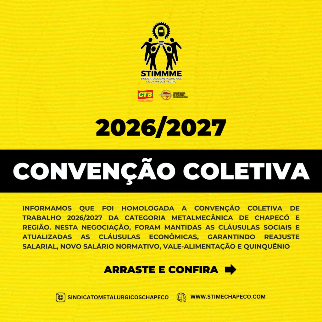O Sindicato dos Metalúrgicos de Chapecó e Região informou a homologação da Convenção Coletiva de Trabalho (CCT) 2026/2027 da categoria metalmecânica. O acordo mantém as cláusulas sociais já existentes e atualiza as cláusulas econômicas, garantindo reajuste salarial, novo salário normativo, vale-alimentação e adicional por quinquênio.