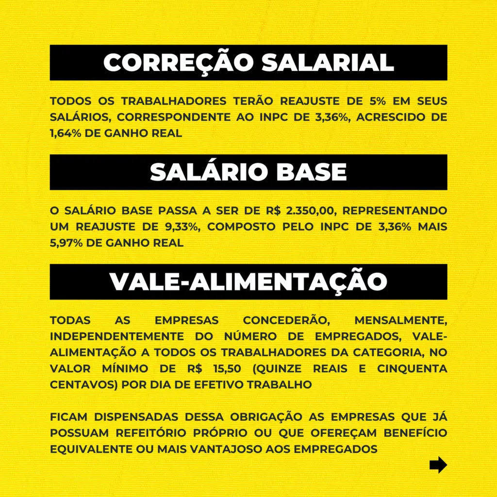 Conforme definido, todos os trabalhadores terão reajuste de 5% nos salários, sendo 3,36% referente ao INPC e 1,64% de ganho real. O salário normativo passa a ser de R$ 2.350,00, representando reajuste de 9,33%, composto por 3,36% do INPC e 5,97% de ganho real.