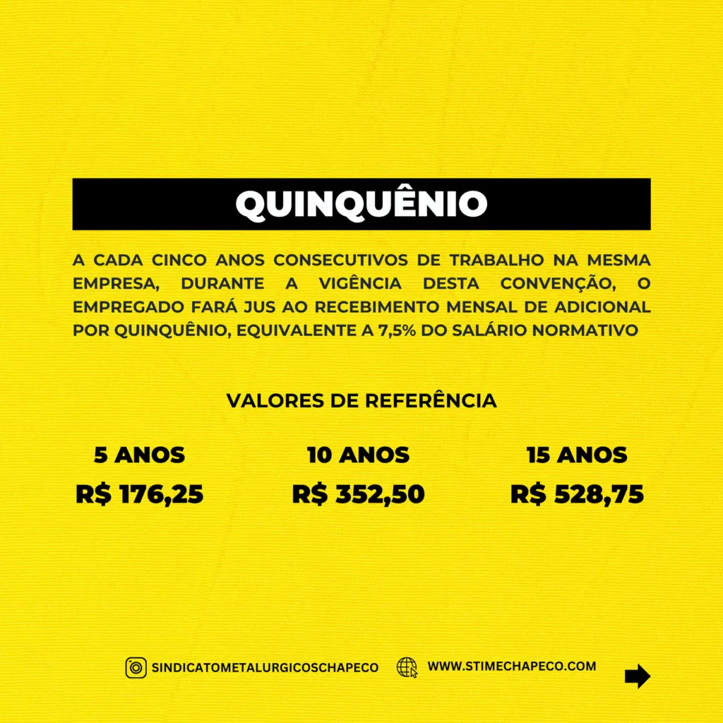 Outro ponto previsto na convenção é o adicional por quinquênio, garantido a cada cinco anos consecutivos de trabalho na mesma empresa, correspondente a 7,5% do salário normativo. Os valores de referência são de R$ 176,25 para 5 anos, R$ 352,50 para 10 anos e R$ 528,75 para 15 anos.