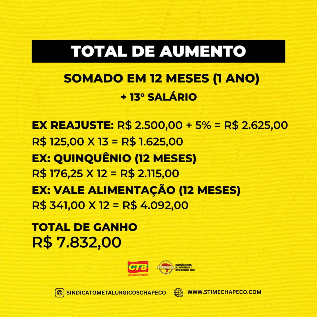 De acordo com o sindicato, os benefícios representam impacto direto na renda dos trabalhadores. Em exemplo apresentado, um trabalhador com salário de R$ 2.500,00 passa a receber R$ 2.625,00 após o reajuste, gerando acréscimo anual de R$ 1.625,00 considerando 13 salários. Somado ao quinquênio anual de R$ 2.115,00 e ao vale-alimentação estimado em R$ 4.092,00 por ano, o ganho total pode chegar a R$ 7.832,00.
