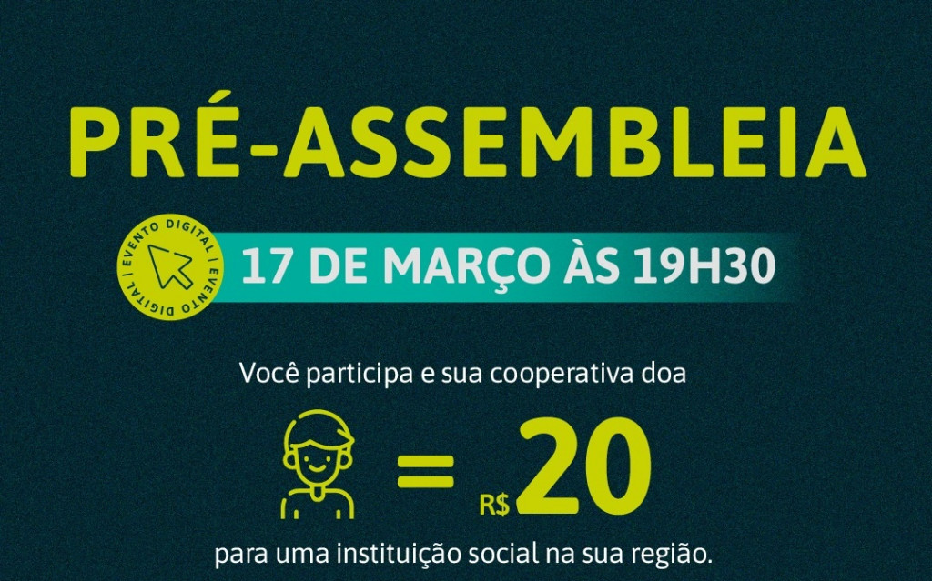 Os cooperados que assistirem à pré-assembleia ainda concorrerão a R$ 200 mil em prêmios. Serão 20 poupanças de R$ 10 mil cada, sorteadas entre os associados que acompanharem a transmissão ao vivo.