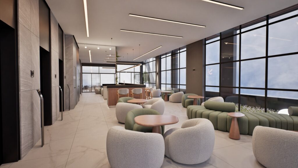 Outro diferencial está na exclusividade: apenas 70 salas comerciais, número reduzido que contrasta com projetos mais amplos, reforçando o posicionamento de mais alto padrão do edifício.