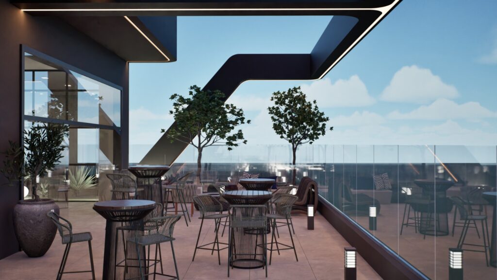 Um dos destaques é o rooftop no 22º andar, que contará com lounge e vista deslumbrante da cidade, oferecendo um ambiente voltado tanto para networking quanto para recepção de clientes em um espaço diferenciado, tendência cada vez mais presente em empreendimentos corporativos de alto padrão.