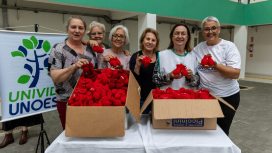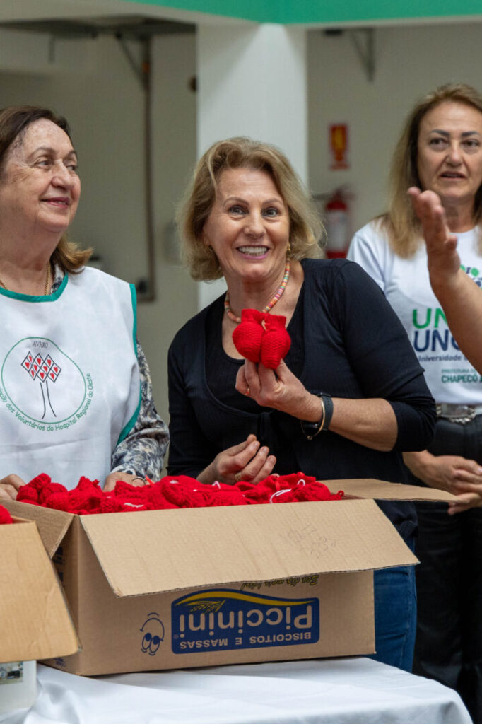 Sapatinhos de lã vermelha que podem ser traduzidos em atos de amor e cuidado. Com essa intenção, os integrantes do Projeto Conexão Solidária, da Universidade da Melhor Idade (Univida) de Chapecó, e demais cursos oferecidos pela Univida, promoveram a confecção de 333 sapatinhos de lã. A doação dos itens foi realizada para a Associação dos Voluntários do Hospital Regional do Oeste (AVHRO).