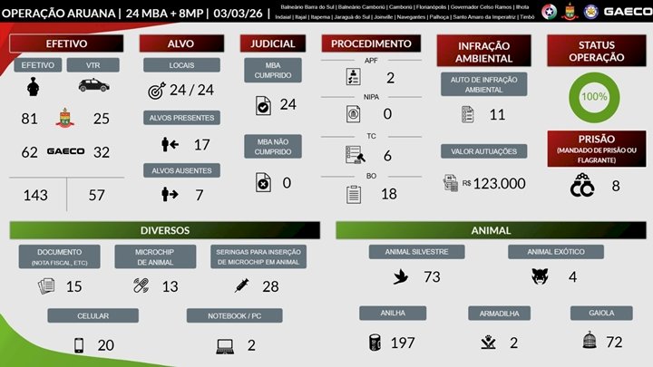 Ao todo, foram cumpridos 45 mandados de busca e apreensão em cinco estados, sendo 24 em Santa Catarina, além de oito mandados de prisão preventiva no estado. As ordens judiciais foram executadas de forma simultânea, com atuação integrada entre a Polícia Militar Ambiental e o GAECO.
