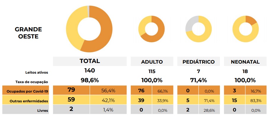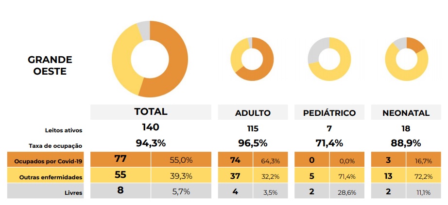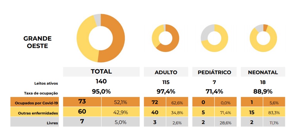 No boletim divulgado pelo Estado nesta quarta-feira, o Grande Oeste registrou 100% de ocupação nos leitos de UTI’s Adulto (115 leitos) e Neonatal (18 leitos).