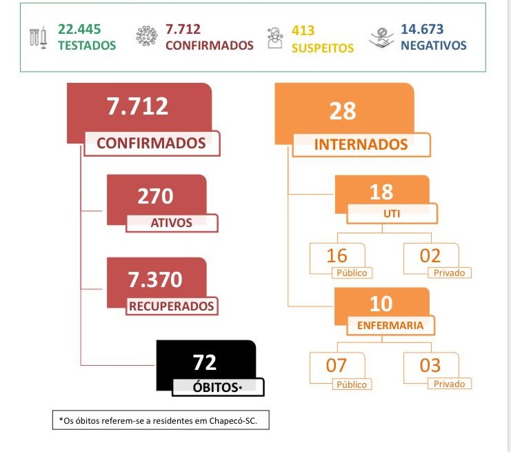 Desde o início da pandemia foram realizados 22.445 testes. Além dos 7.712 casos confirmados, o município registrou 14.673 casos negativos. Em Chapecó, 72 pessoas morreram em decorrência da doença, segundo os dados divulgados pela Prefeitura.