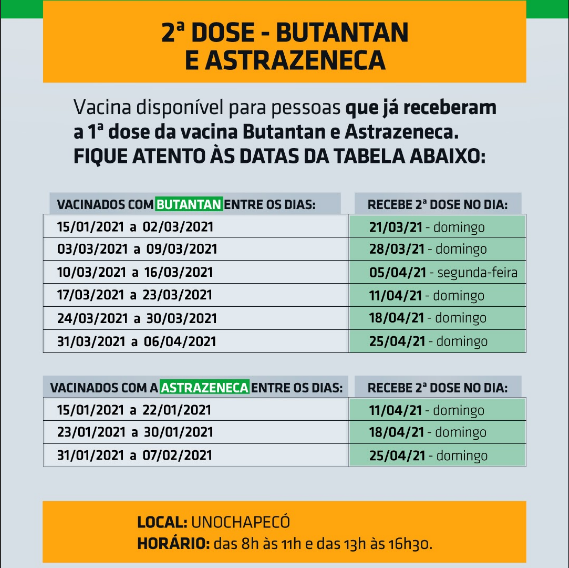 InícioSAÚDEChapecó divulga calendário para aplicação da segunda dose da vacina contra a...