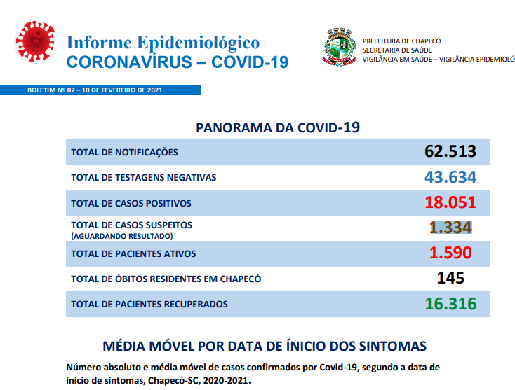 Chapecó está com 1.590 casos ativos de coronavírus, nesta quarta-feira (10). Há ainda 1.334 pacientes que aguardam resultados de exames. O município chegou ao total de 18.051 diagnósticos positivos, desde o início da pandemia. Deste total, 16.316 pessoas são consideradas recuparadas.