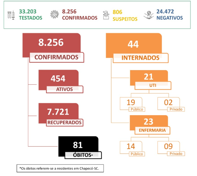Segundo dados da prefeitura, foram realizados 33.203 testes no município. Além dos 8.256 diagnósticos positivo, outros 24.472 testes tiveram resultado negativo para doença.