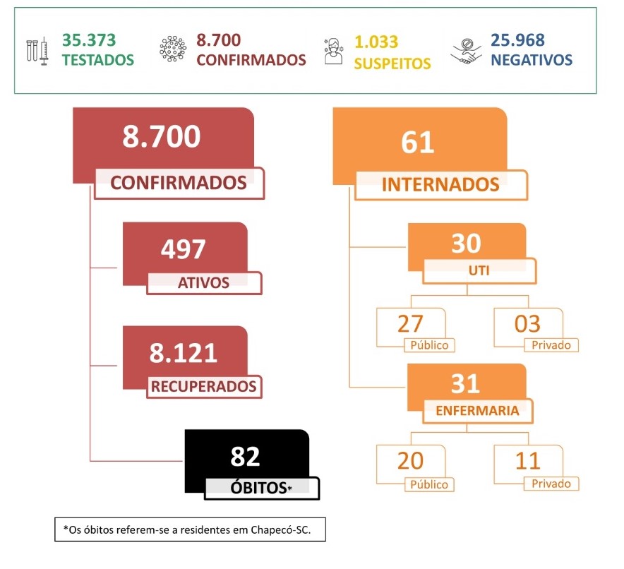 Desde o início da pandemia, 8.700 pessoas tiveram diagnóstico positivo para coronavírus, em Chapecó (SC). Deste total, 497 pacientes estão com o vírus ativo e 8.121 são considerados recuperados. Nesta sexta-feira (13), segundo dados da Prefeitura, o munícipio alcançou 1.033 casos suspeitos da doença.