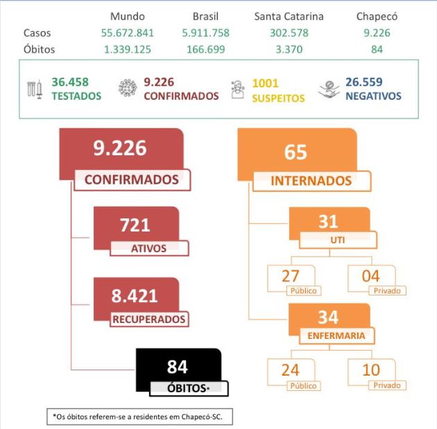 Desde o início da pandemia, 9.226 pessoas tiveram diagnóstico positivo para coronavírus, em Chapecó (SC). Deste total, 721 pacientes estão com o vírus ativo e 8.421 são considerados recuperados. Nesta quarta-feira (18), segundo dados da Prefeitura, o munícipio alcançou 1.001 casos suspeitos da doença.