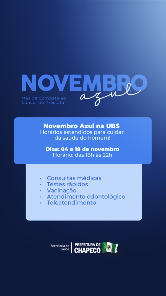 A Prefeitura de Chapecó, por meio da Secretaria de Saúde, realiza nesta terça-feira (4) e no dia 18 de novembro uma série de ações alusivas ao Novembro Azul, com atendimento estendido nas Unidades de Saúde, das 18h às 22h. As atividades têm como objetivo estimular a prevenção, o diagnóstico precoce e ampliar o acesso dos homens aos serviços de saúde.
