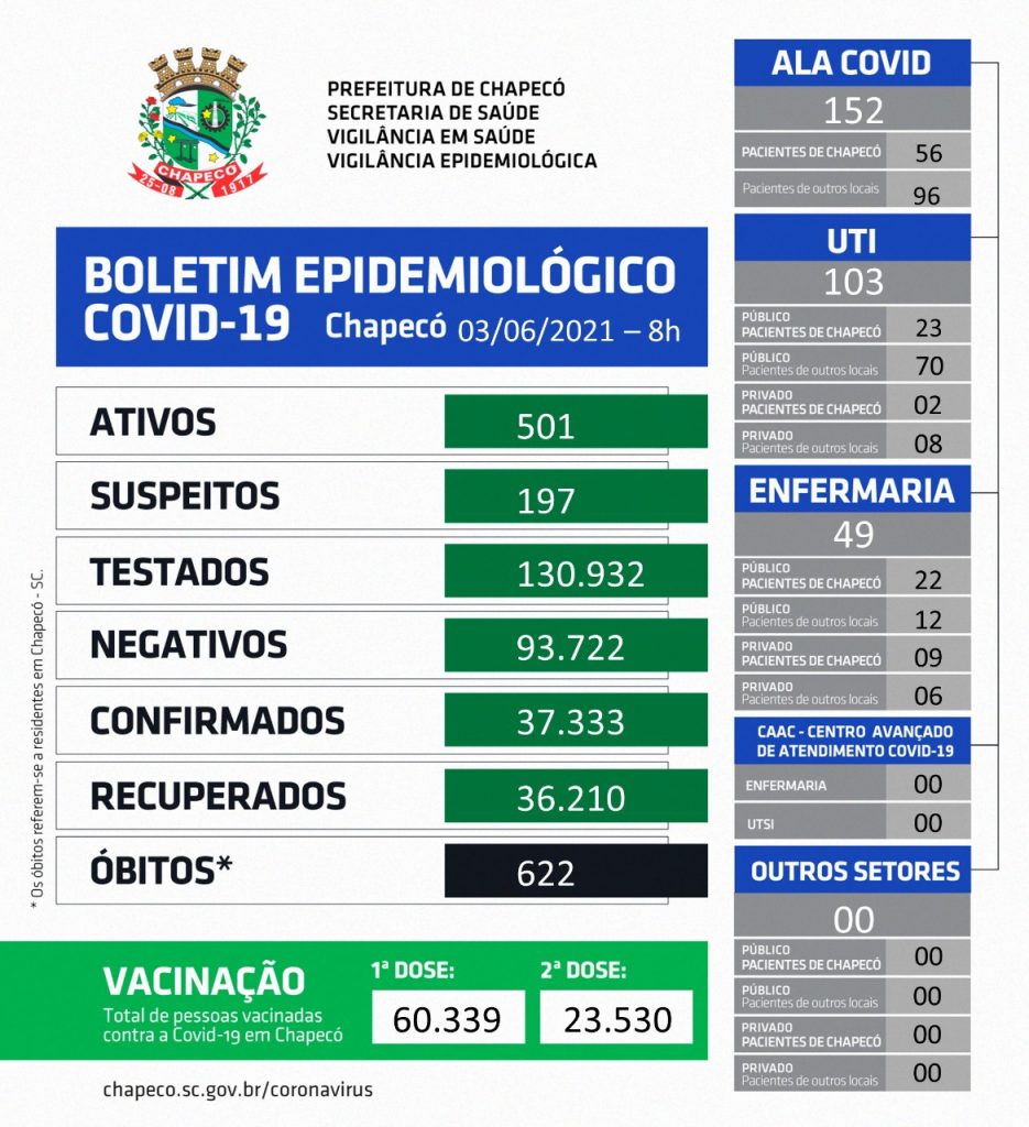 A prefeitura divulgou o Boletim Covid desta quinta-feira (03) que informa um óbito de uma mulher de 94 anos, ocorrido no Hospital Regional do Oeste (HRO) no dia de hoje. Ao todo, são 622 chapecoenses vítimas da Covid-19.