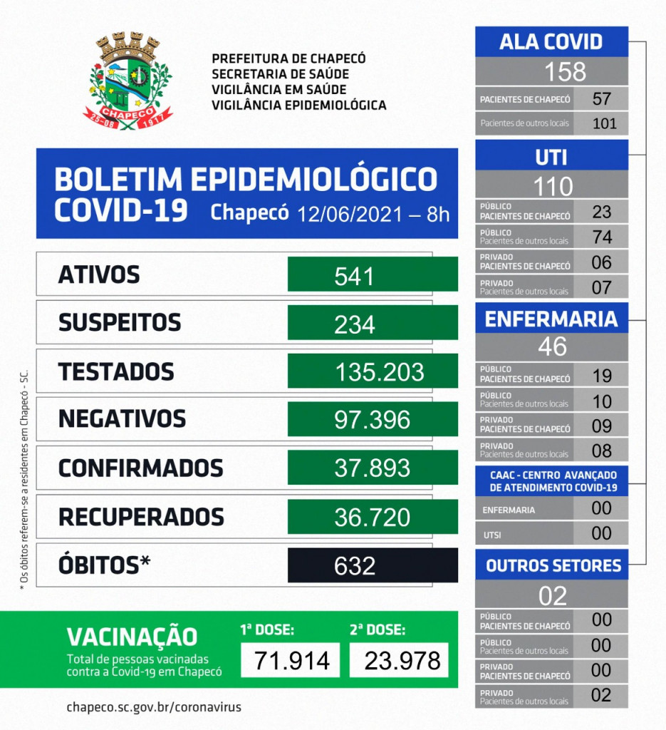 De acordo com a Prefeitura, a vítima é uma mulher, de 60 anos, no Hospital Regional do Oeste (HRO). Com o registro, são 632 chapecoenses que faleceram devido a Covid-19 desde o início da pandemia.