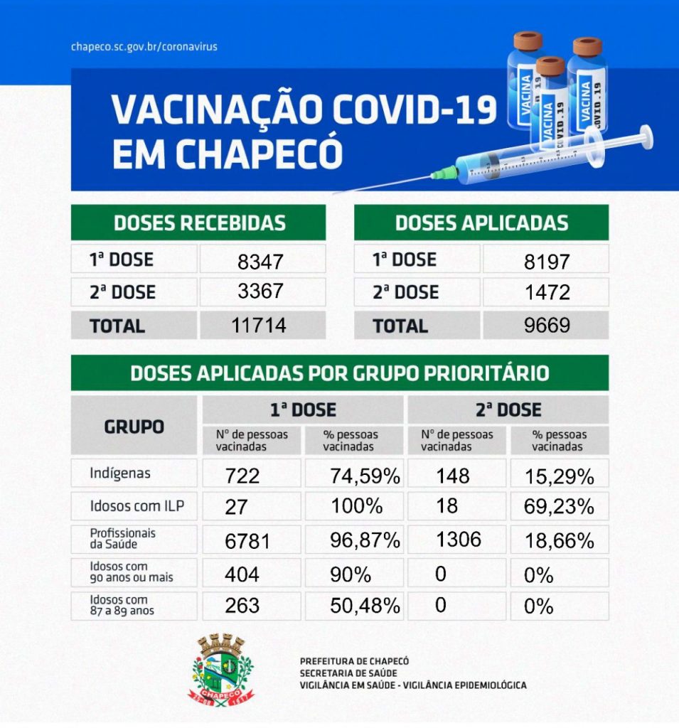 A prefeitura de Chapecó também repassou informações sobre as doses aplicadas por grupos proprietários. Conforme a Administração Municipal, 722 indígenas (74,59% do total), 27 idosos em instituição de longa permanência (100% do total), 6.781 profissionais da Saúde (96,87% do total), 404 idosos com 90 anos ou mais (90% do total) e 263 idosos com 87 a 89 anos (50,48% do total) já receberam a primeira dose da vacina contra à Covid-19.