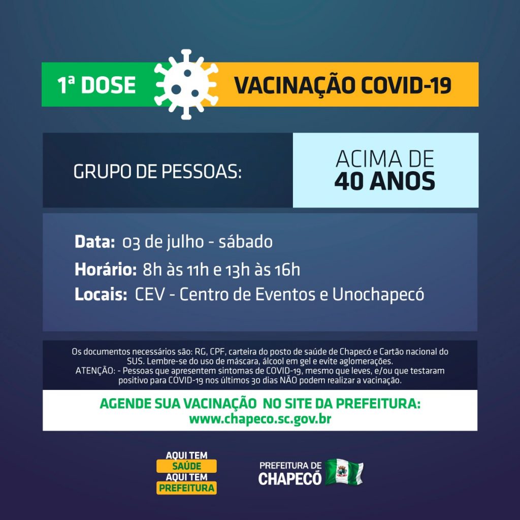 Na sexta-feira, terá vacinação para 40, 41, 42 anos ou mais, além de motoristas, profissionais de saúde, comorbidades, lactantes e gestantes. Os locais são o Centro Estratégico de Vacinação (Centro de Eventos), Unochapecó e as unidades de Saúde Norte, Leste, Santa Maria e Efapi.