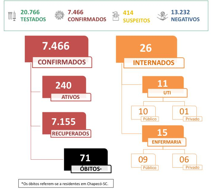 Desde o início da pandemia foram realizados 20766 testes, dos quais 7.466 teve resultado positivo para coronavírus e outros 13.232 deram negativo. Dos casos confirmados em Chapecó, 7.155 são considerados recuperados. O município registrou 71 mortes (todos moradores de Chapecó) em decorrência da doença.