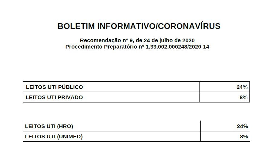 Na rede privada há um paciente internado em leito de UTI, com isso a ocupação é de 8%. No total, são 26 pessoas internadas, além das 11 que estão na UTI, há 15 em leitos de enfermaria, das quais nove estão no HRO e seis na Unimed.