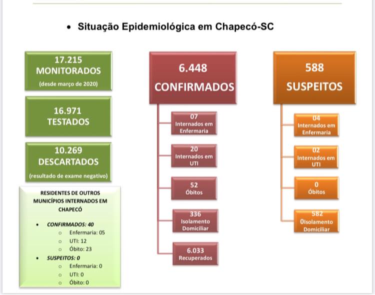 Desde o início da pandemia, 6.448 pessoas foram diagnosticadas com coronavírus. Do total de diagnósticos, 6.033 são considerados recuperados e 363 estão ativos. Há 588 casos considerados suspeitos, que aguardam resultado de exames. As informações foram divulgadas nesta segunda-feira (7), pela Administração Municipal.