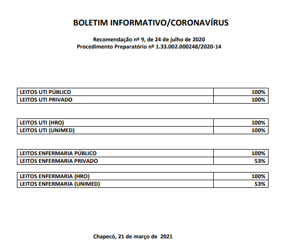 O Boletim diário aponta que há 258 pessoas internadas em Chapecó, neste domingo. Do total, 127 estão em leitos de UTI, 79 em enfermaria e 52 estão em outros setores. Todos os leitos são destinados a pacientes com Covid-19.