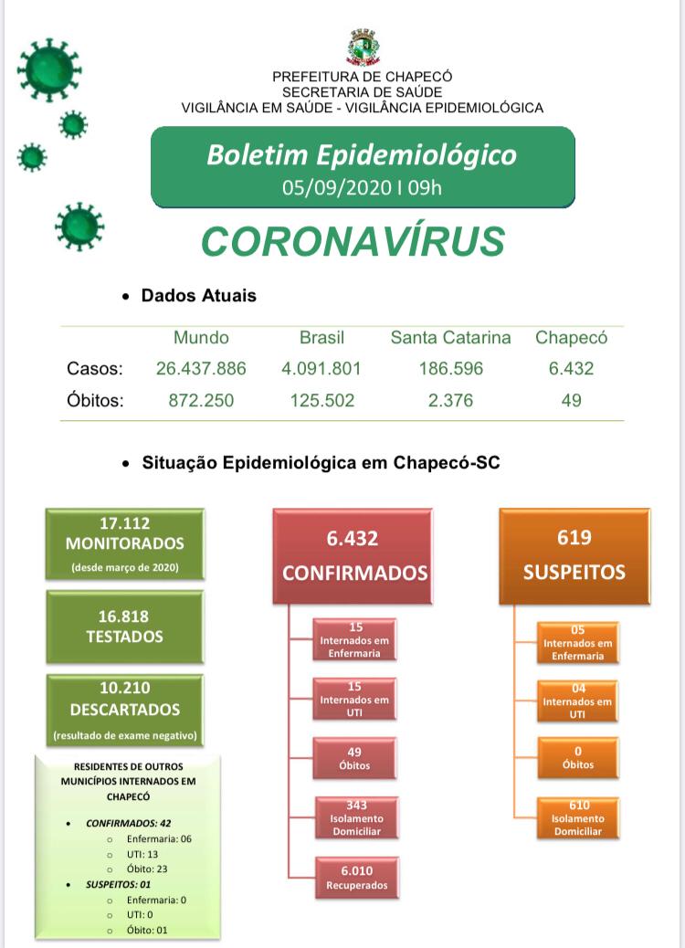 Chapecó chegou a 6.432 casos confirmados neste sábado (5). Segundo a atualização da Administração Municipal, entre o número total de pacientes, 6.010 estão recuperados. Desde o início da pandemia, 49 pessoas que tiveram o diagnóstico para Covid-19 vieram a óbito em Chapecó. O município registrou neste sábado, 32 pessoas internadas em Unidades de Terapia Intensiva (UTI).