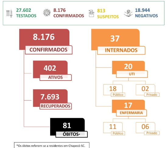 Em uma semana, o número total de casos confirmados da doença passou de 7.943 para 8.176, em Chapecó (SC). Foram 233 novos diagnósticos positivos para a doença, entre a última terça-feira (27) e hoje (3). Também aumentou o número de casos suspeitos da doença – que passou de 475 para 813 . São 338 pacientes a mais do que o divulgado na última semana.