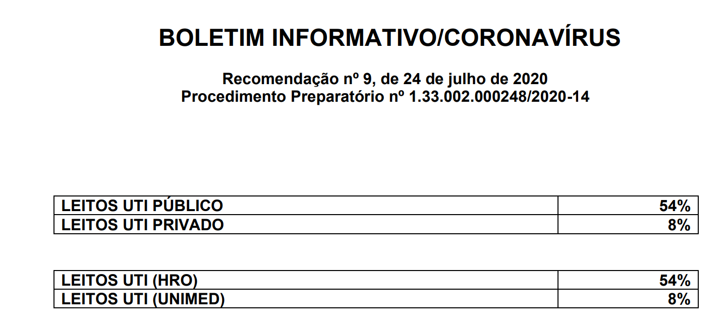 Há uma pessoa internada em leito de UTI na Unimed, conforme o boletim. A ocupação da rede privada é de 8%. De sexta-feira (23) a domingo (25), não havia nenhum paciente internado na Unimed.
