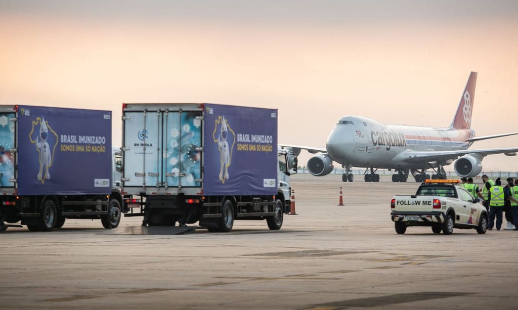 O produto, vindo da China, chegou ao Aeroporto Internacional do Rio de Janeiro (Tom Jobim/Galeão) às 6h22 deste domingo (28). Inicialmente, o voo estava previsto para chegar às 18h de sábado (27). O motivo da mudança da data se deveu a um atraso na conexão do voo.