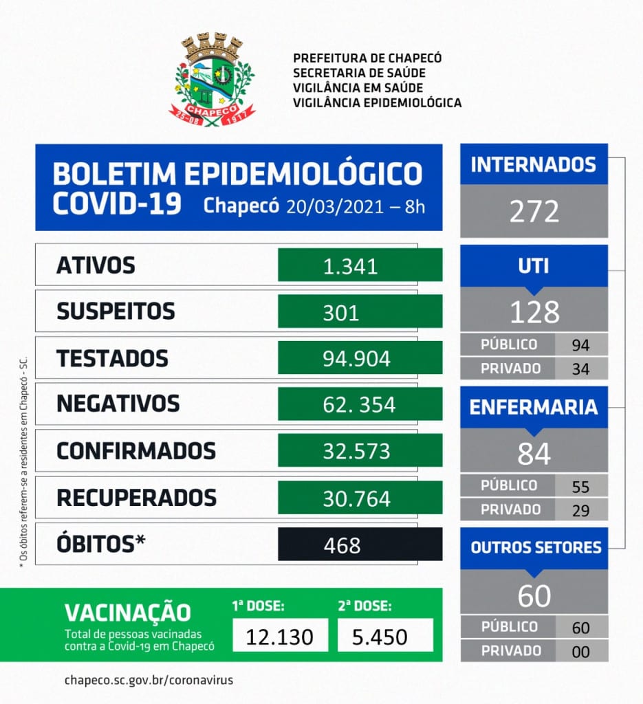 Neste sábado (20), data que marca um ano desde que houve a confirmação da circulação do vírus no município, 468 chapecoenses faleceram em decorrência de complicações da Covid-19. Durante os últimos 12 meses, 32.573 casos da doença foram confirmados. Deste total, 30.674 pacientes estão recuperados da doença.